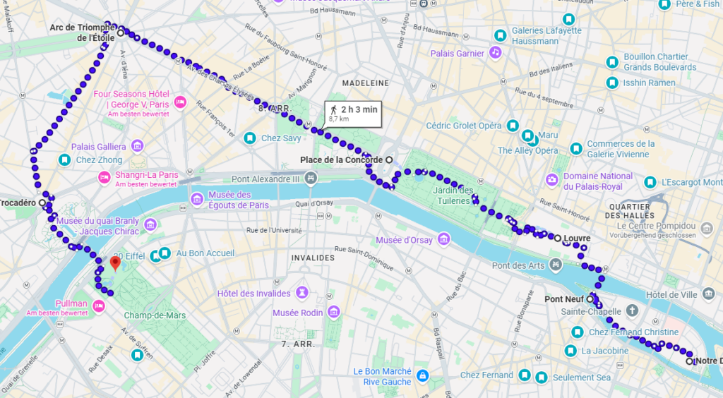 My first recommendation is this route. You start this two hour walk at the famous church Notre Dame and end it at the Eiffel Tower. On this route you will see the Louvre, the Place de la Concorde, the Avenue de Champs-Élysées ,the arc de triomph and the overcrowded Place du Trocadero. Here you can see the Eiffel Tower in a good distance to take some pictures. Because you will see so much on this route you will need way more than just two hours.